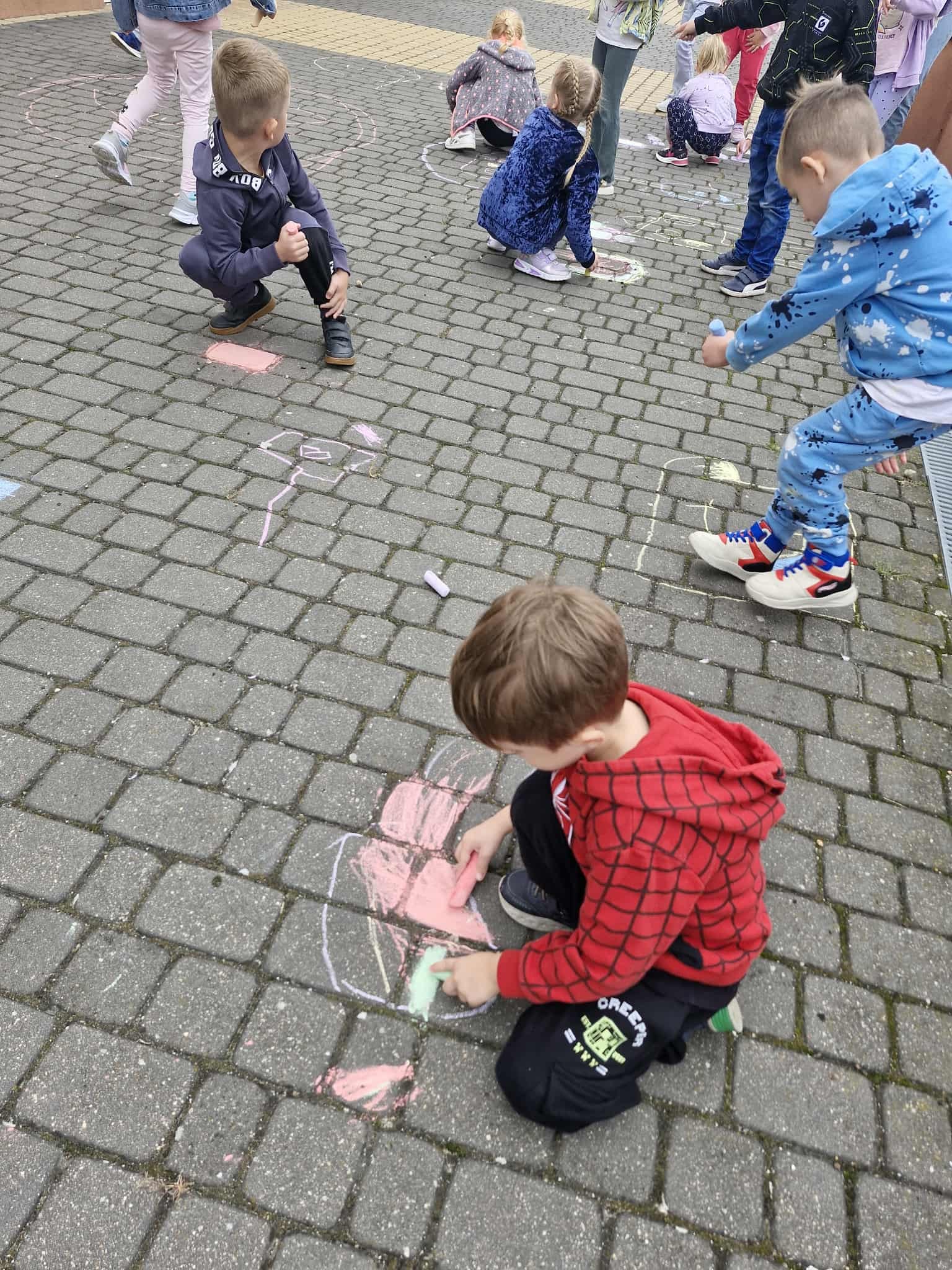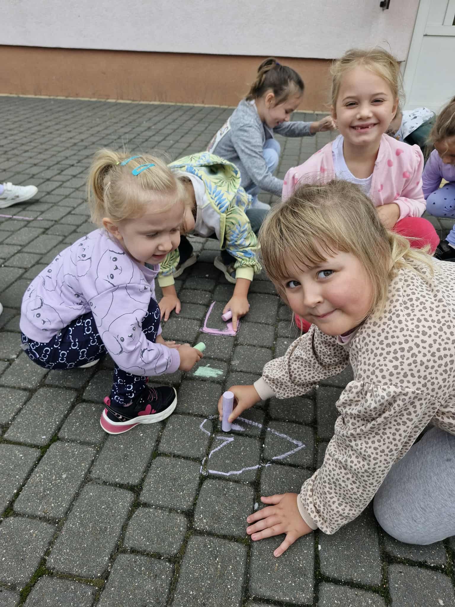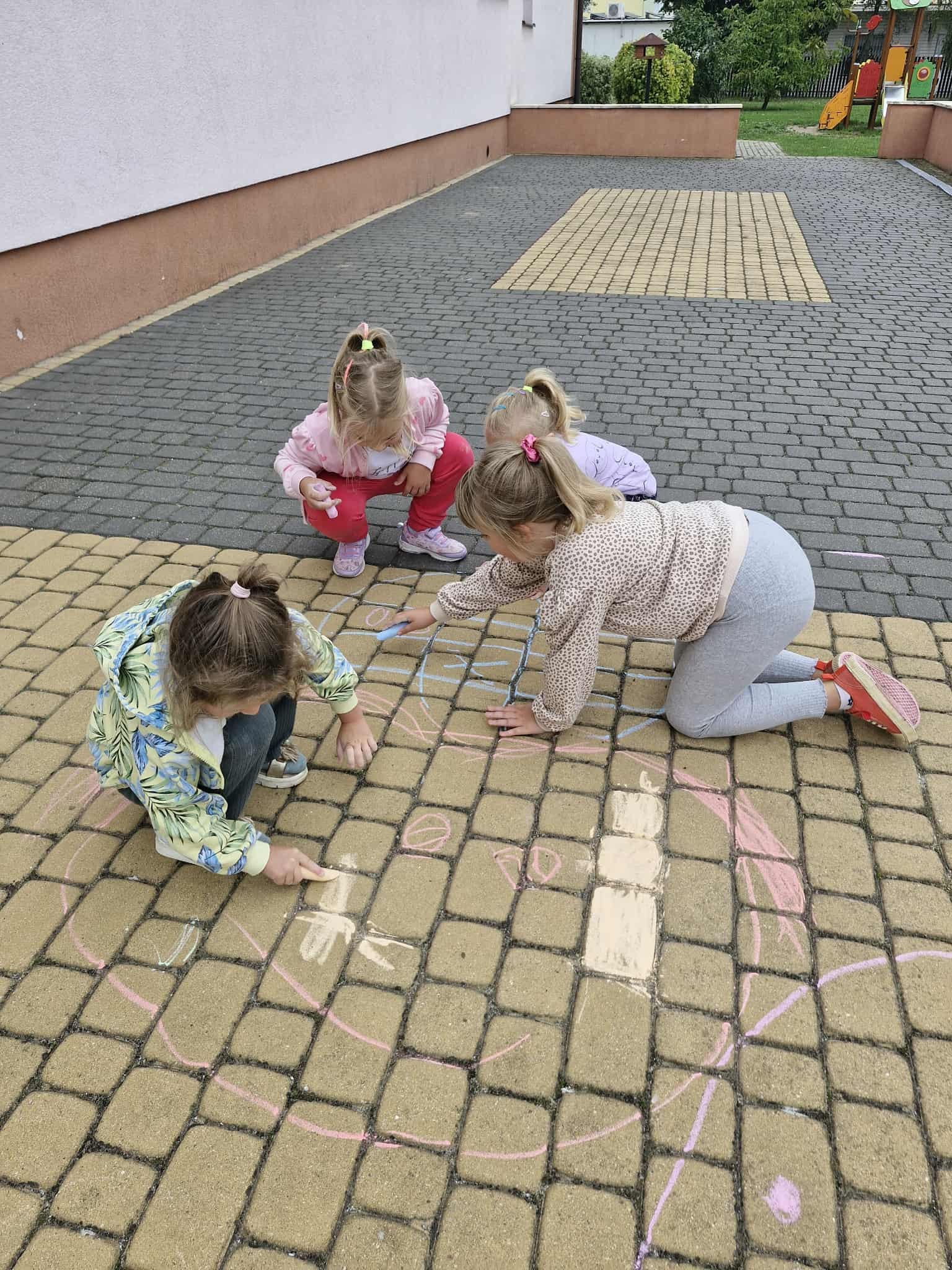 W Dniu Kropki dzieci z grupy Króliczki wybrały się do przedszkolnego ogrodu, w którym na chodnikowych płytach, za pomocą kolorowej kredy wykonywały kolorowe obrazki. Każdy przedszkolak znalazł sobie odpowiednie miejsce do pracy i rozpoczął twórcze malowanie….![]()
