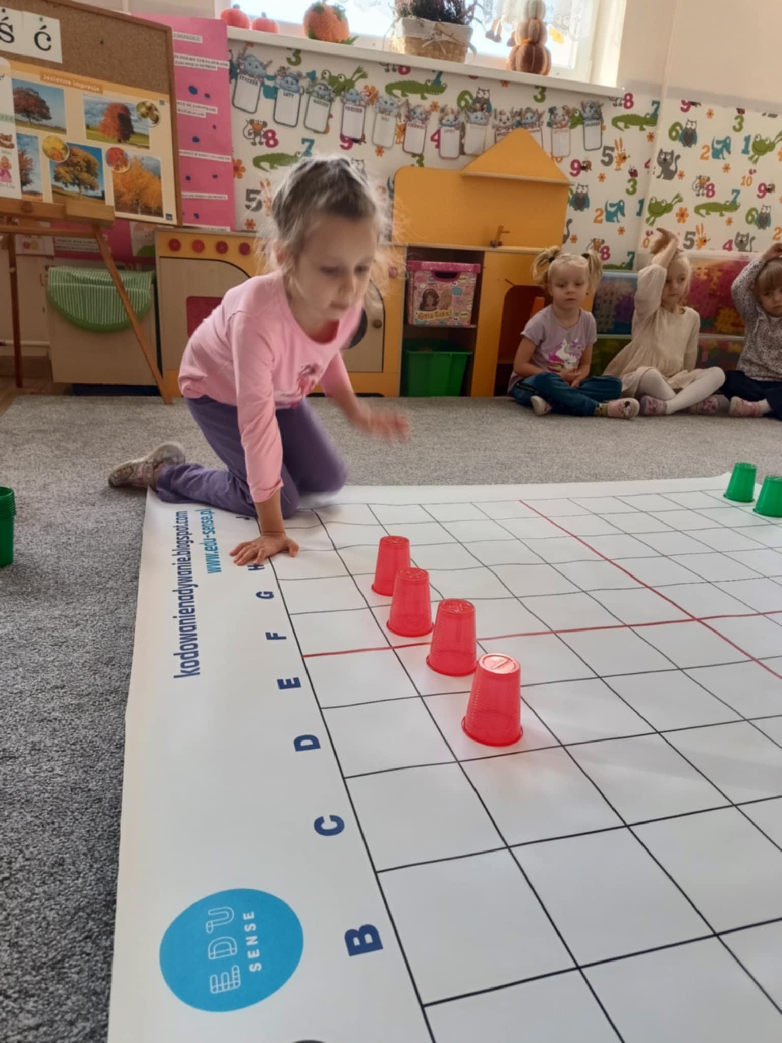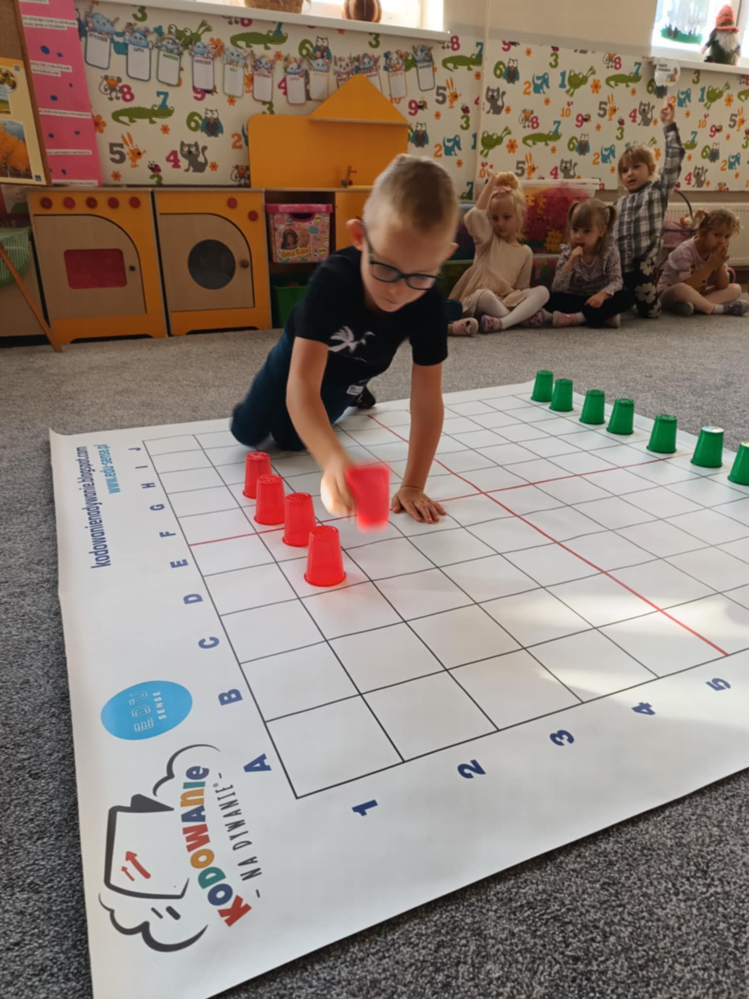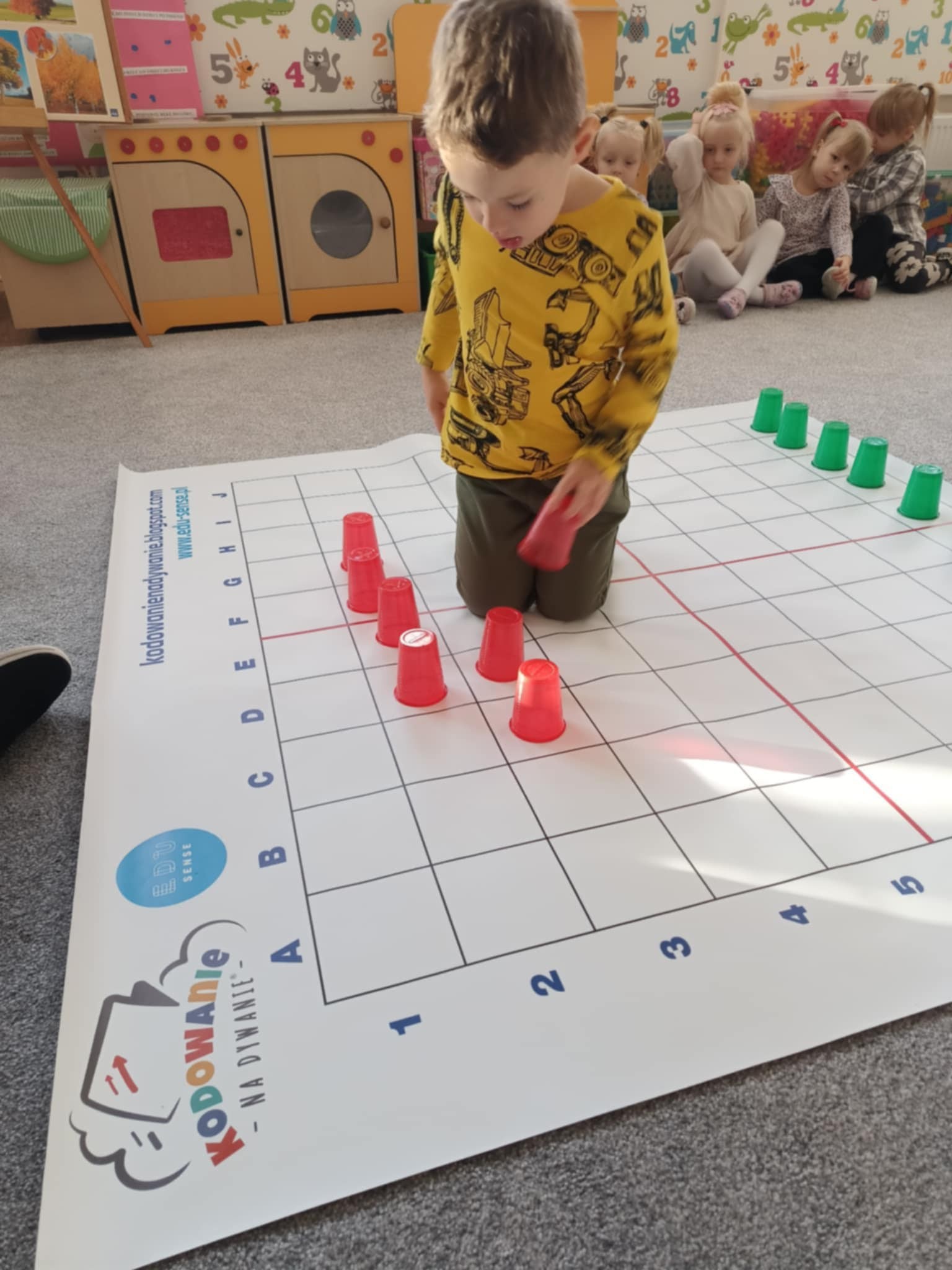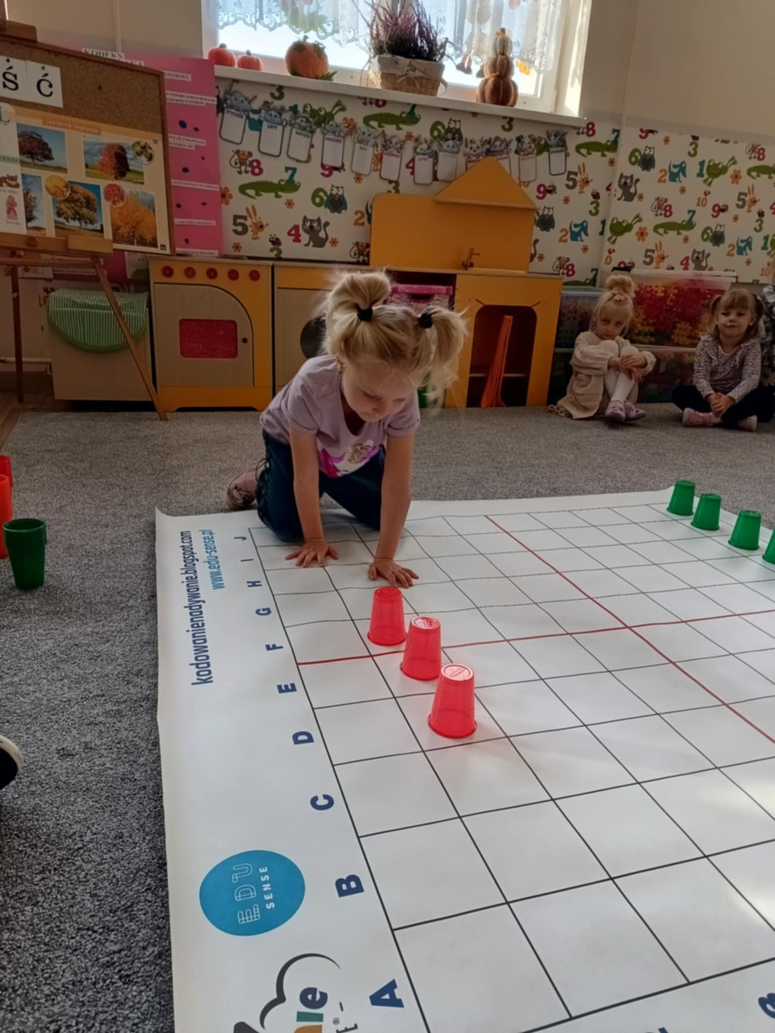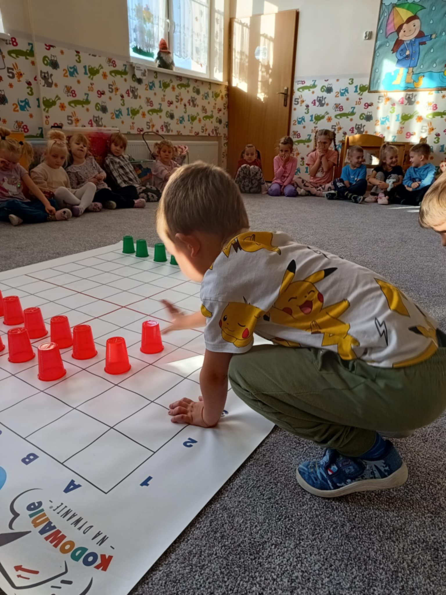 ,,Jesienne kodowanie” w grupie ,,Kruczki”. Dzieci podczas zajęć rozwijały logiczne i algorytmiczne myślenie oraz orientację przestrzenną. Rozwijały również percepcję wzrokową i koordynację wzrokowo – ruchową. Kodowały obrazek na macie stosując pojęcia: góra, dół, w lewo, w prawo. Aktywność ta bardzo spodobała się dzieciom i na pewno będzie początkiem przygody z nauką kodowania.