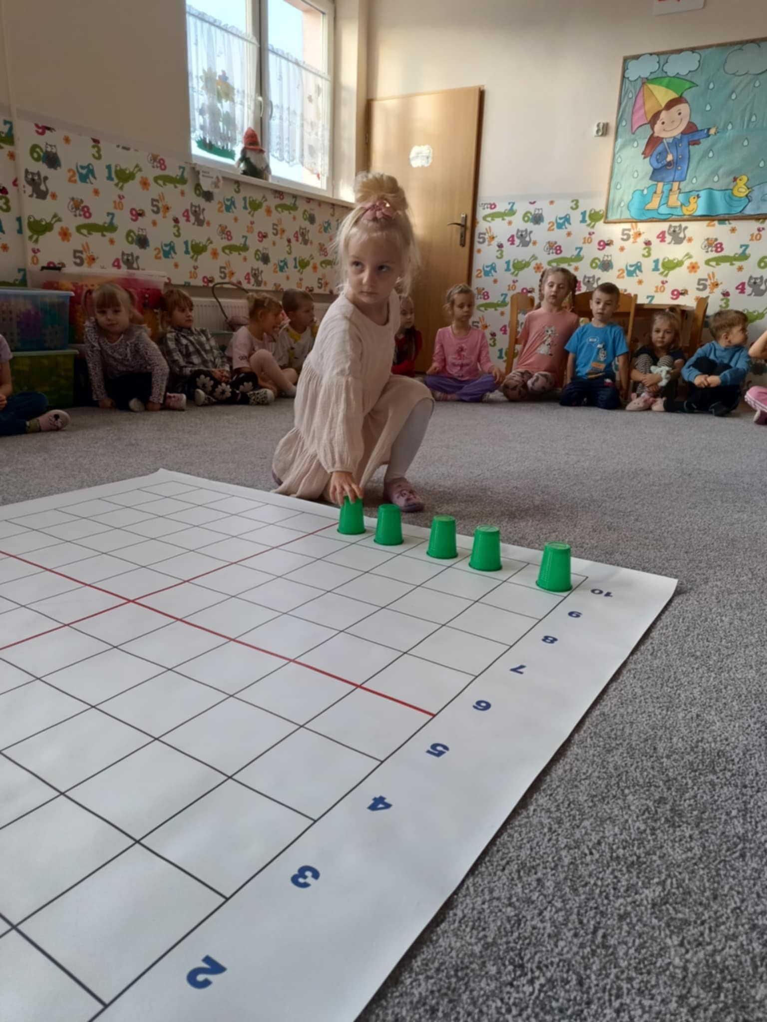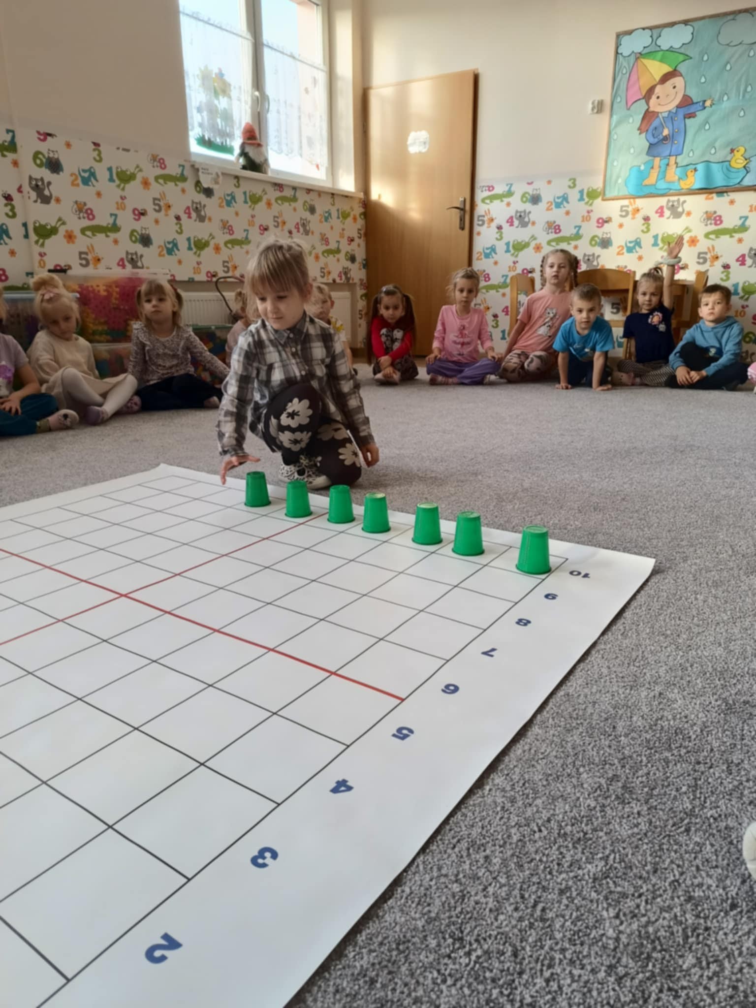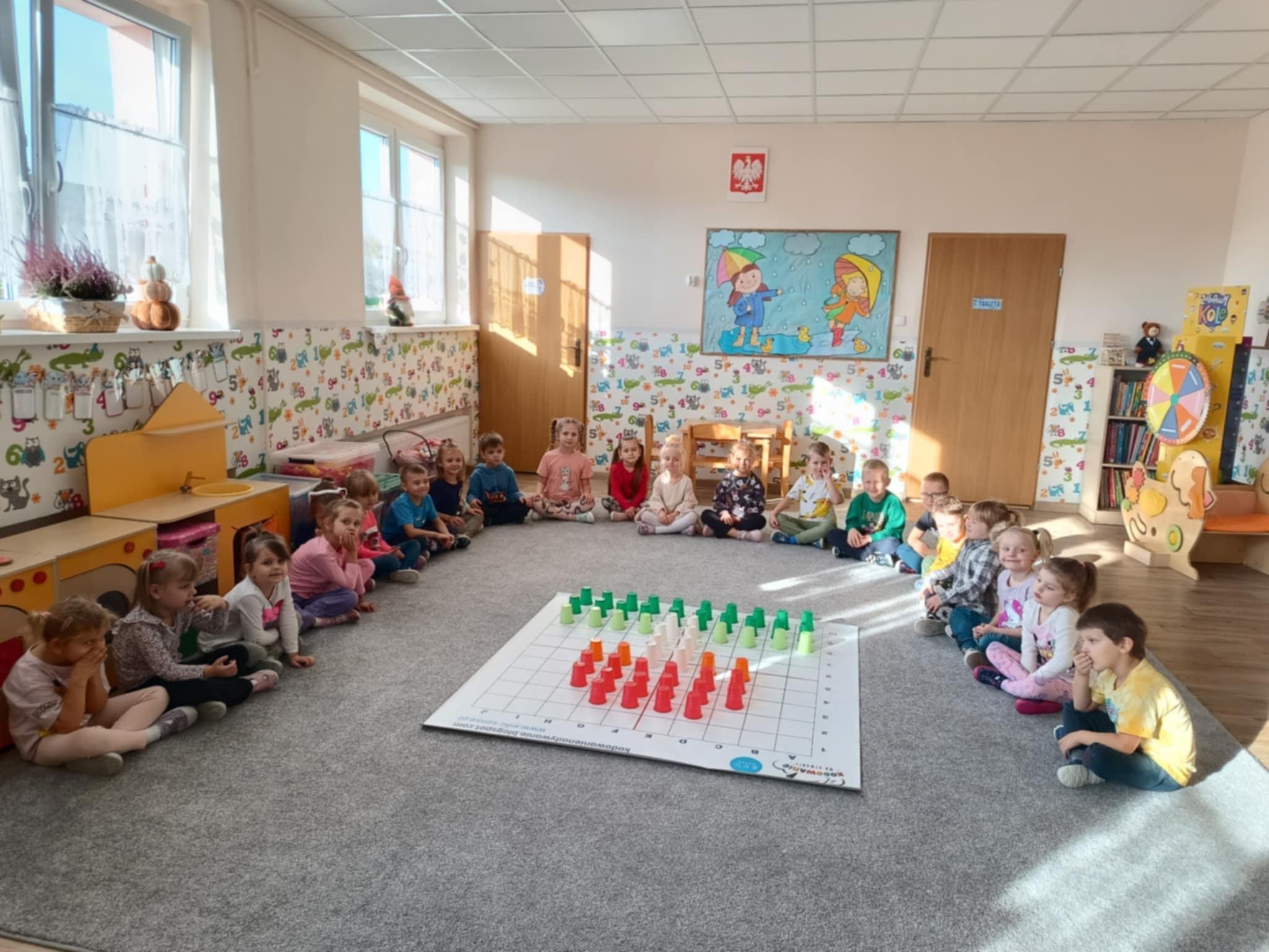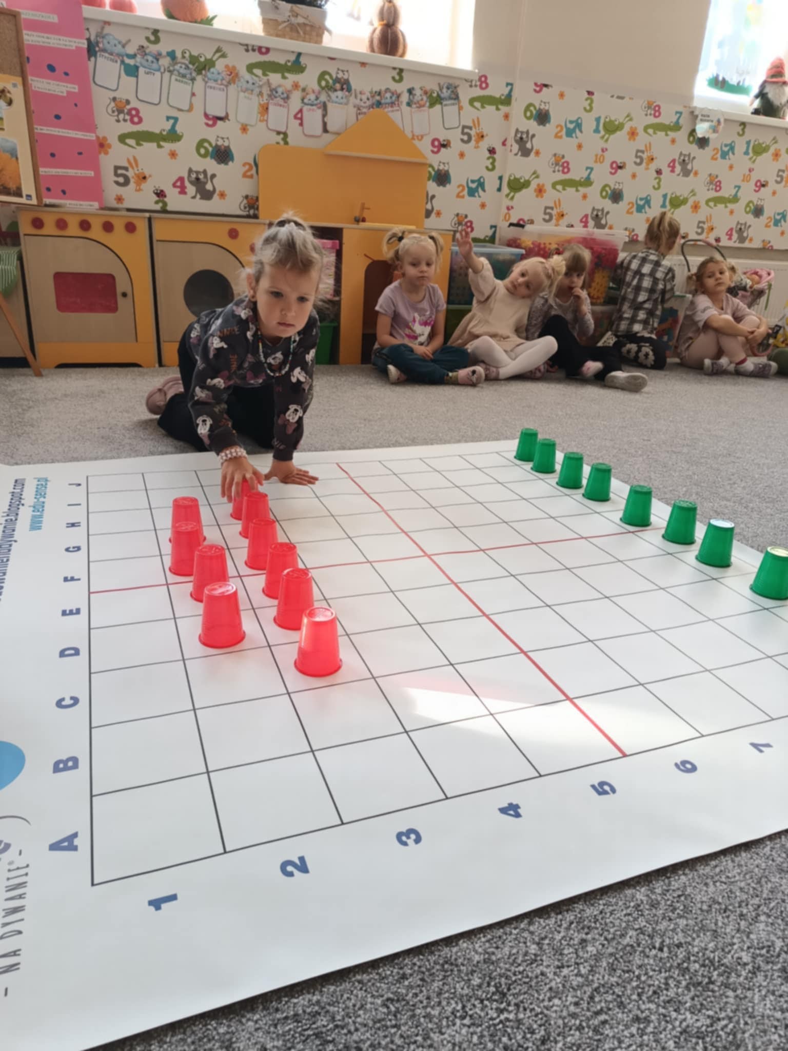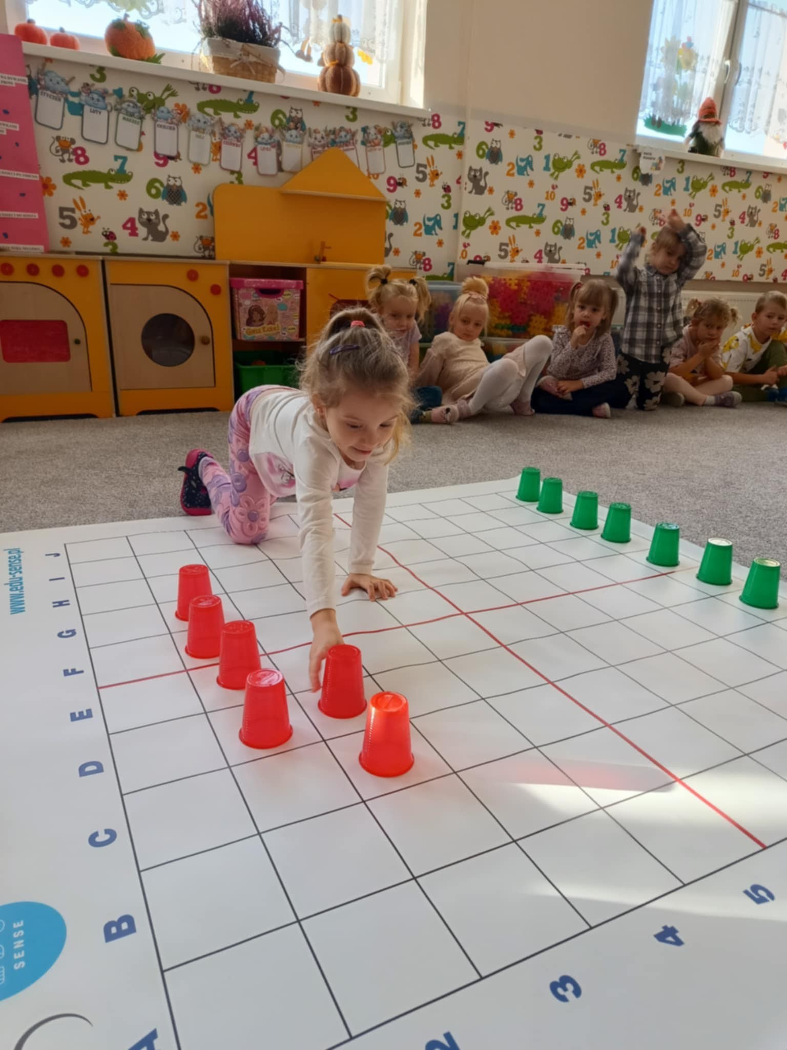 ,,Jesienne kodowanie” w grupie ,,Kruczki”. Dzieci podczas zajęć rozwijały logiczne i algorytmiczne myślenie oraz orientację przestrzenną. Rozwijały również percepcję wzrokową i koordynację wzrokowo – ruchową. Kodowały obrazek na macie stosując pojęcia: góra, dół, w lewo, w prawo. Aktywność ta bardzo spodobała się dzieciom i na pewno będzie początkiem przygody z nauką kodowania.