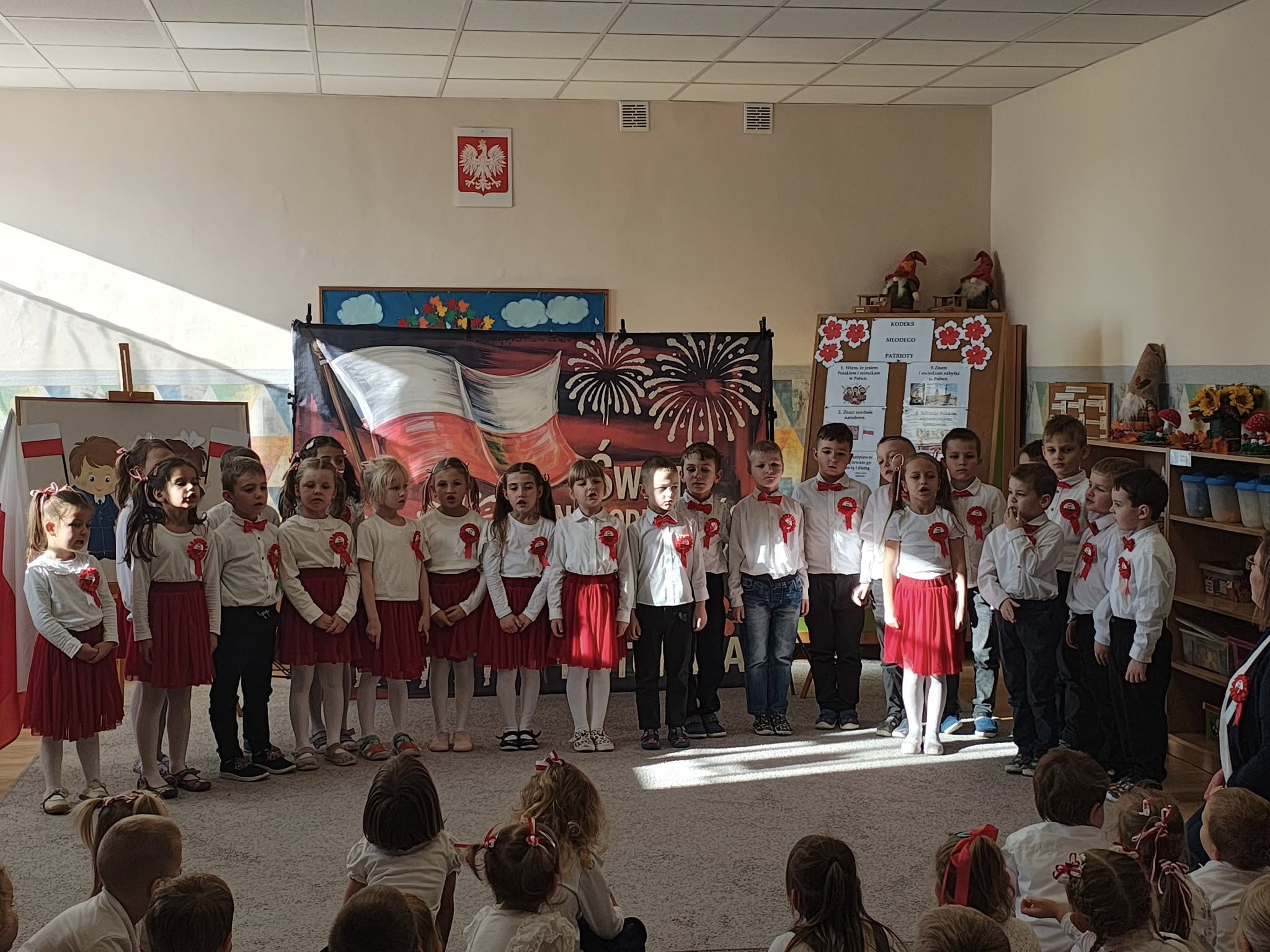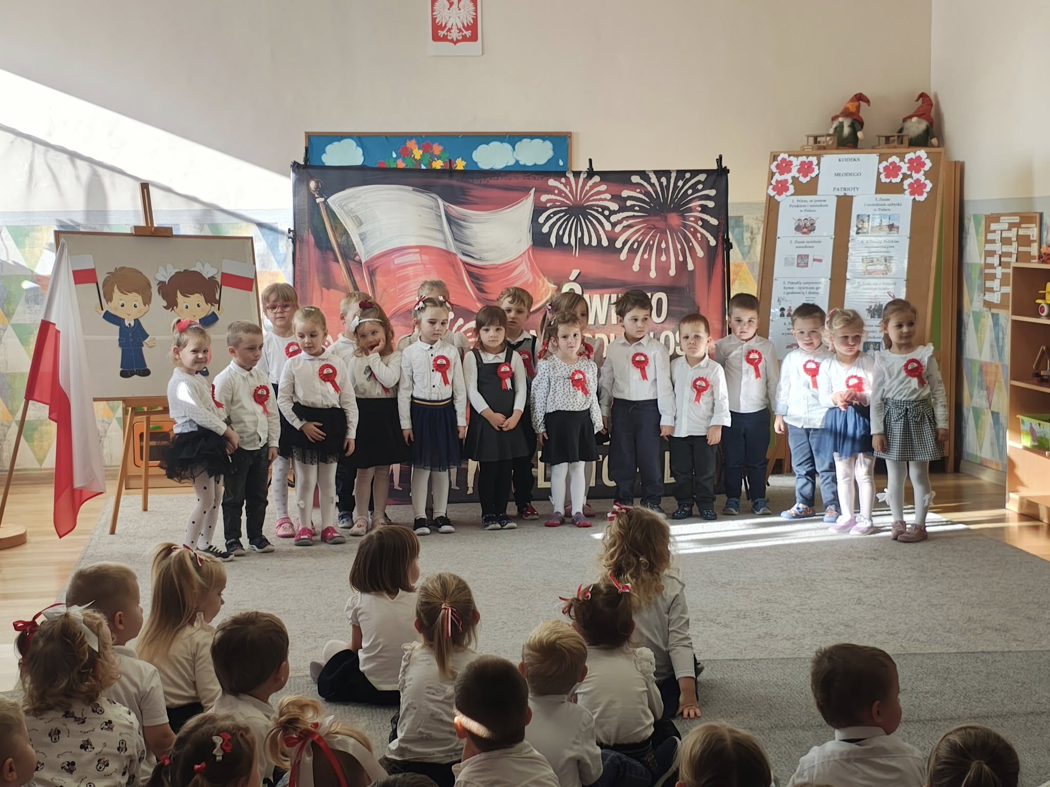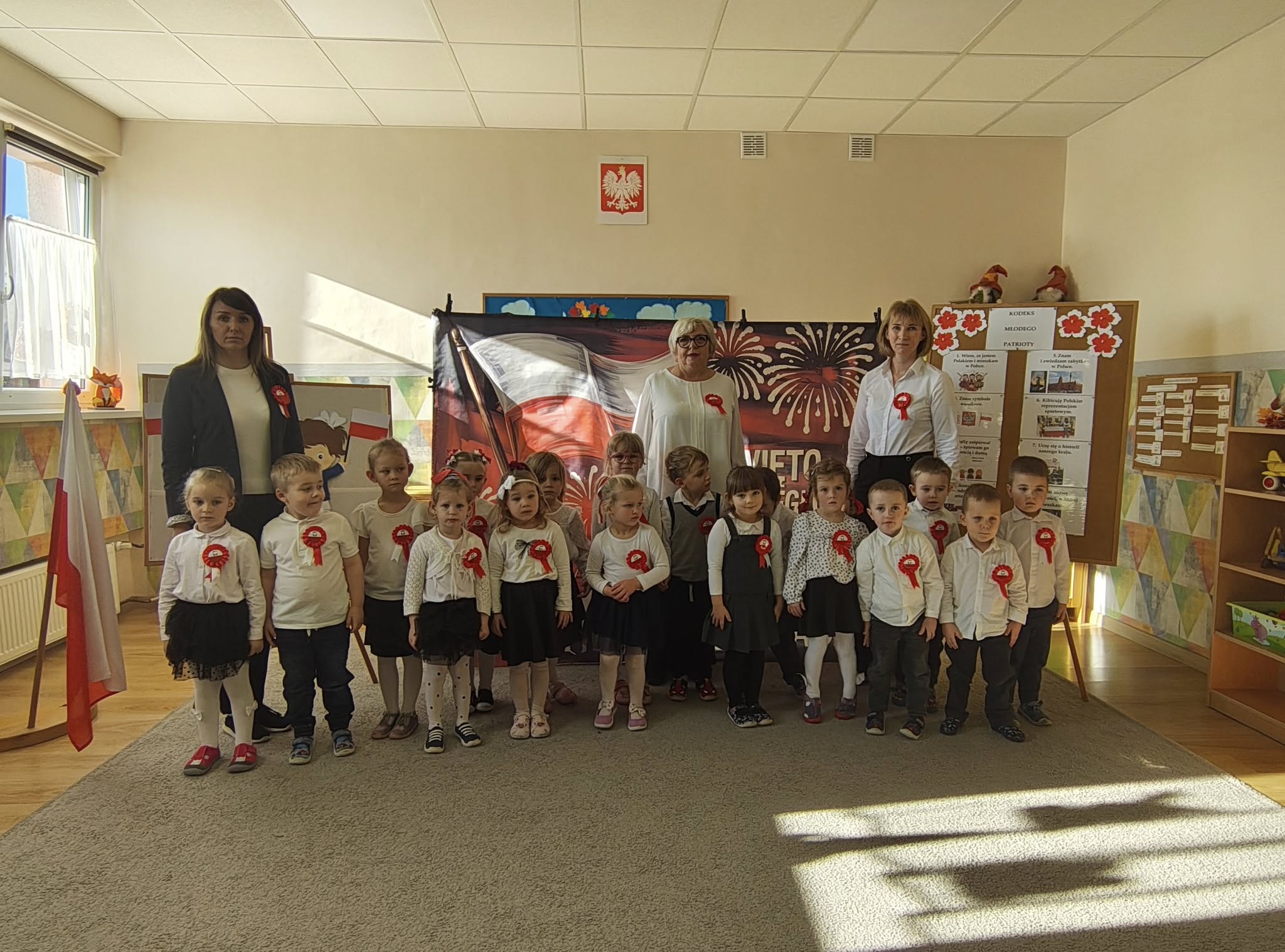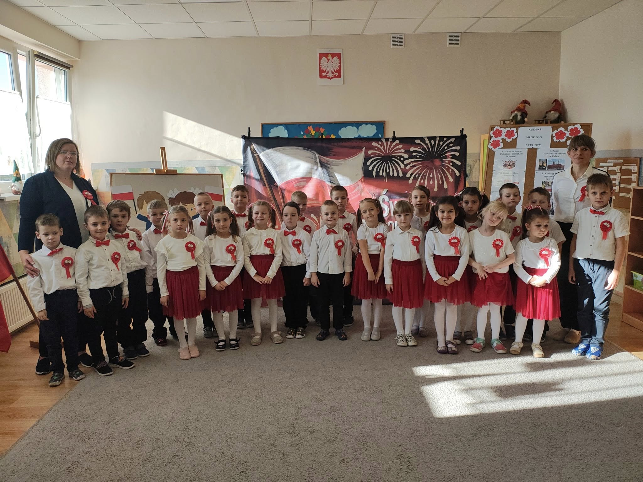 W przedszkolu odbyła się uroczystość z okazji Narodowego Święta Niepodległości. Dzieci odświętnie ubrane zaprezentowały wiersze i piosenki o tematyce patriotycznej. Włączyliśmy się również w ogólnopolską akcję „Szkoła do hymnu” i o symbolicznej godzinie 11.11 odśpiewaliśmy „Mazurka Dąbrowskiego”. Była to doskonała okazja, aby w przystępny sposób przybliżyć dzieciom historię naszego kraju, utrwalić symbole narodowe oraz ukazać znaczenie wolności i niepodległości Polski.