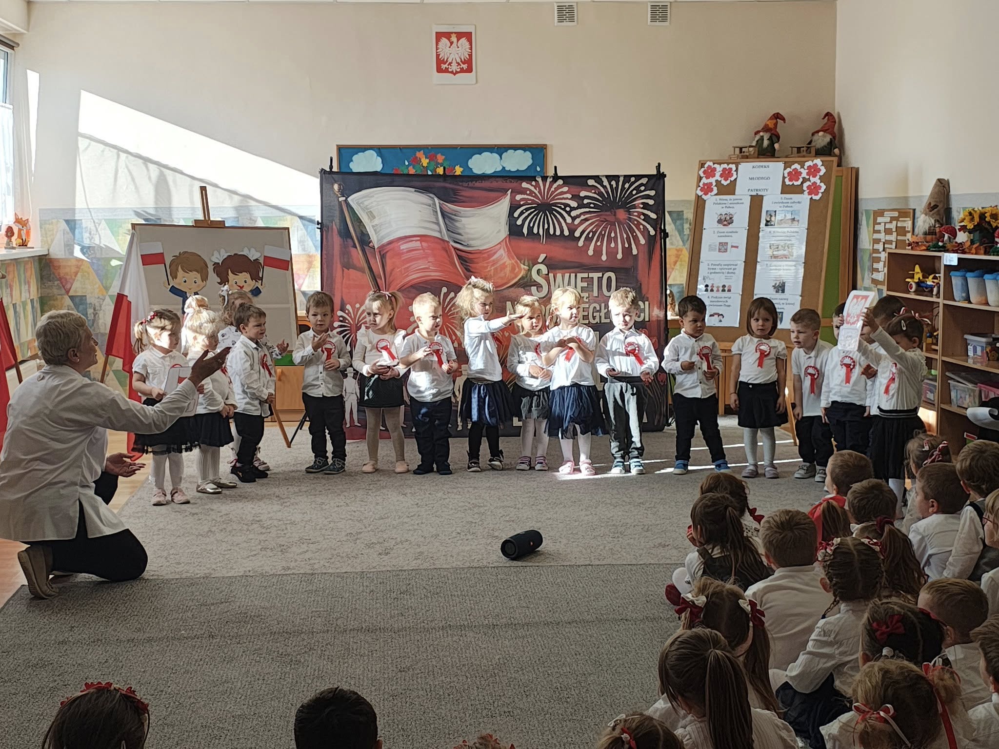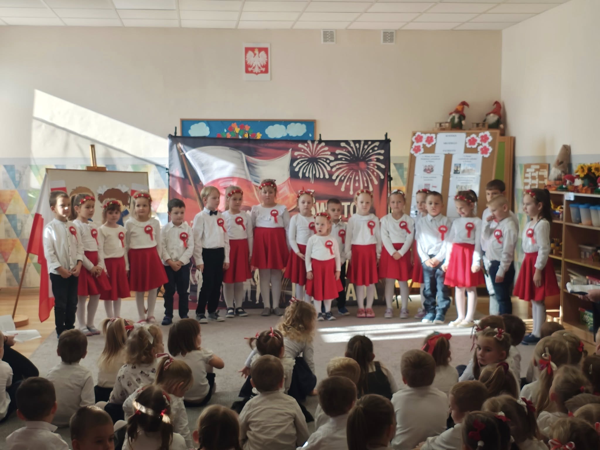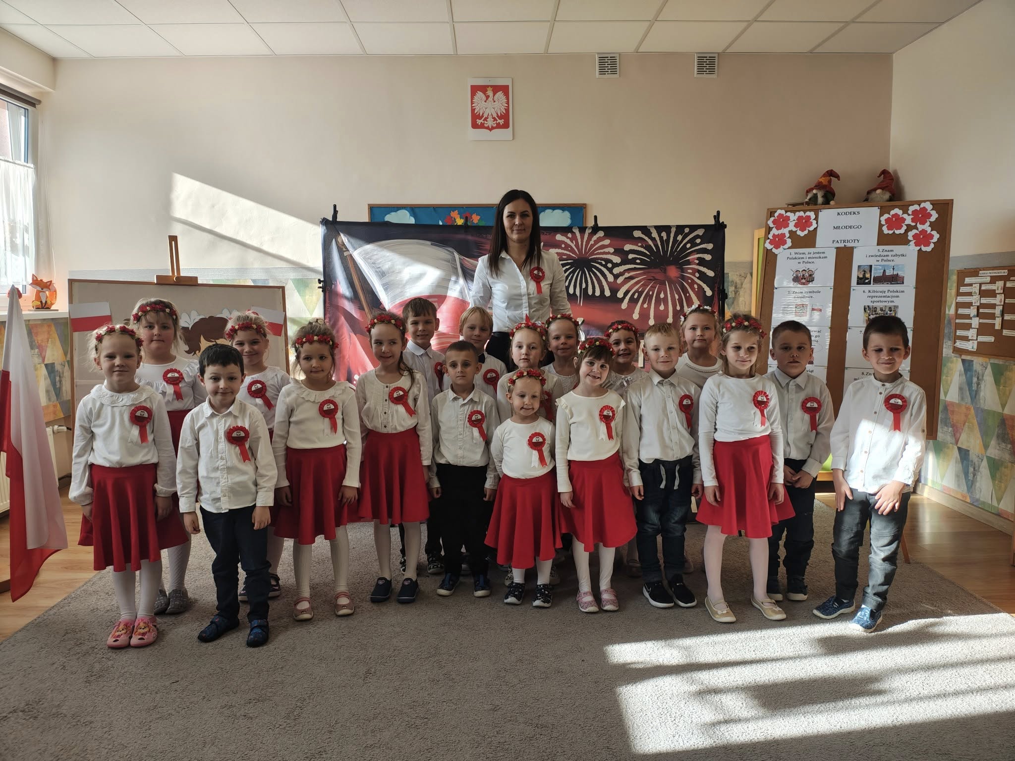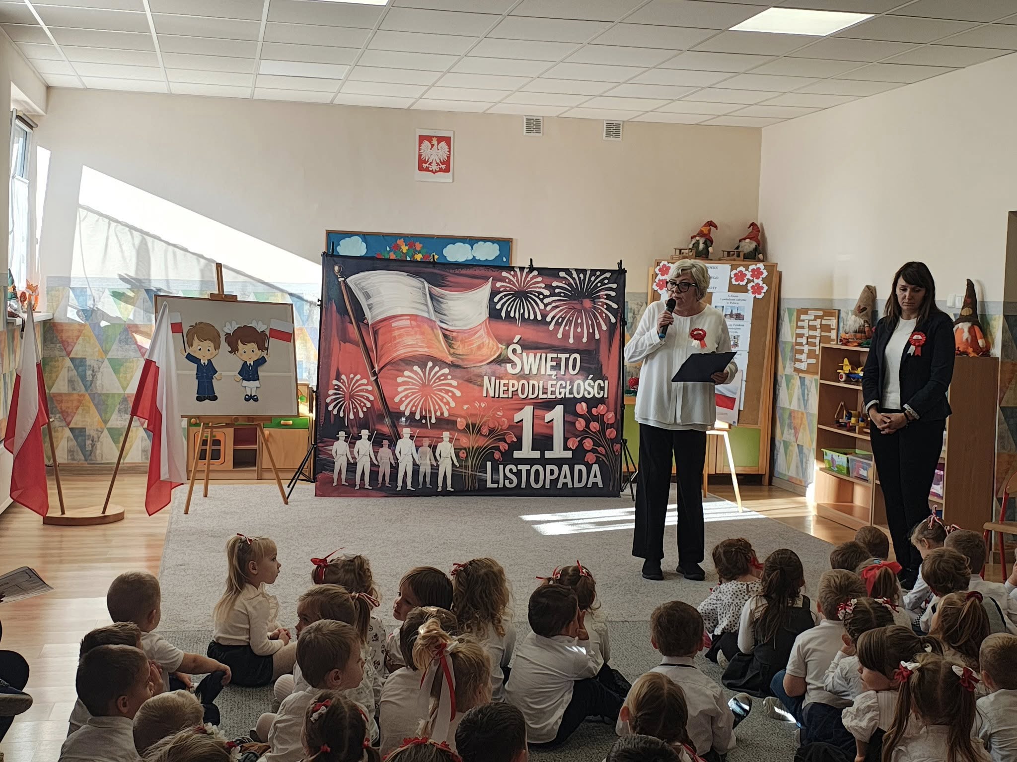 W przedszkolu odbyła się uroczystość z okazji Narodowego Święta Niepodległości. Dzieci odświętnie ubrane zaprezentowały wiersze i piosenki o tematyce patriotycznej. Włączyliśmy się również w ogólnopolską akcję „Szkoła do hymnu” i o symbolicznej godzinie 11.11 odśpiewaliśmy „Mazurka Dąbrowskiego”. Była to doskonała okazja, aby w przystępny sposób przybliżyć dzieciom historię naszego kraju, utrwalić symbole narodowe oraz ukazać znaczenie wolności i niepodległości Polski.