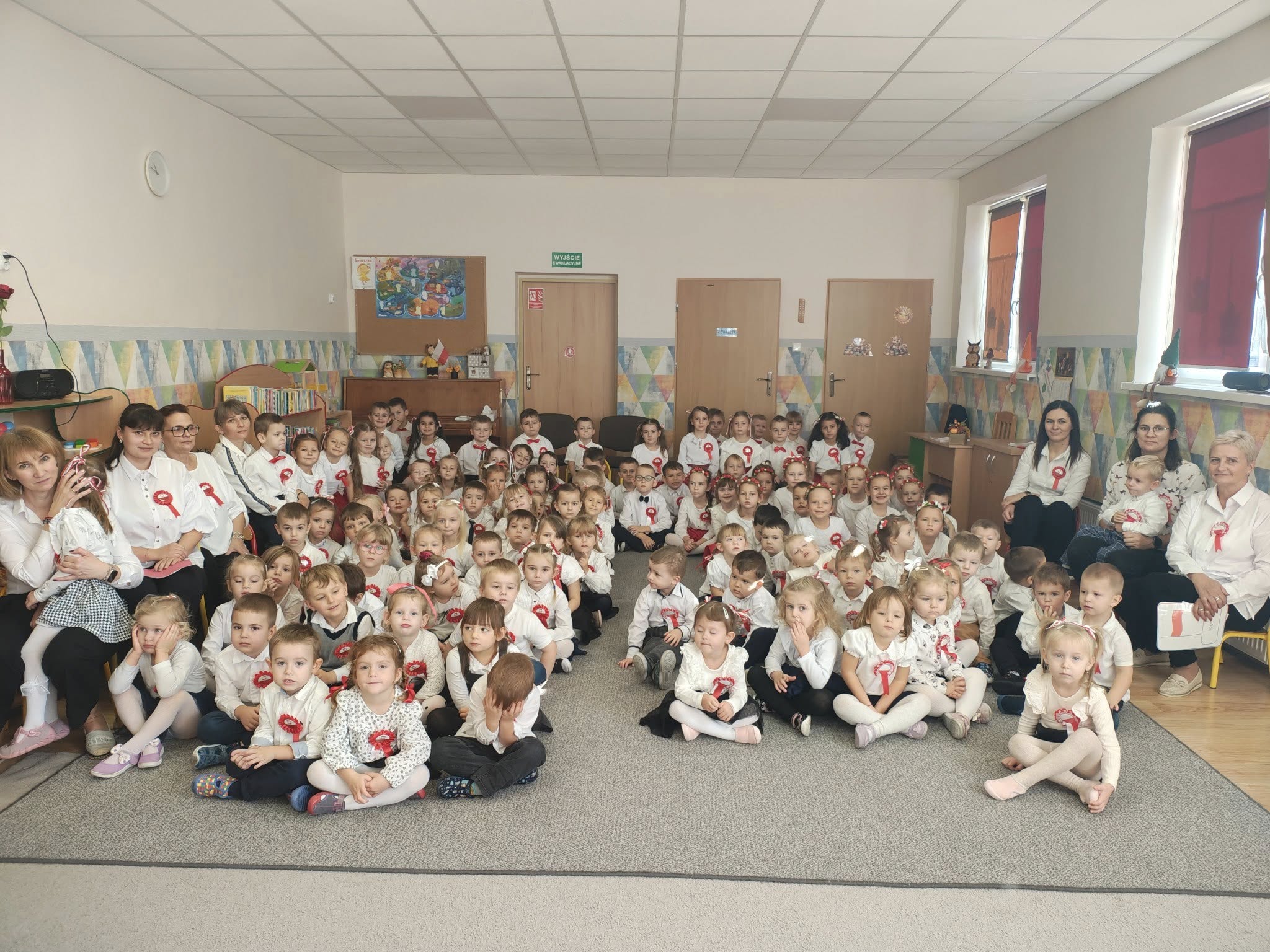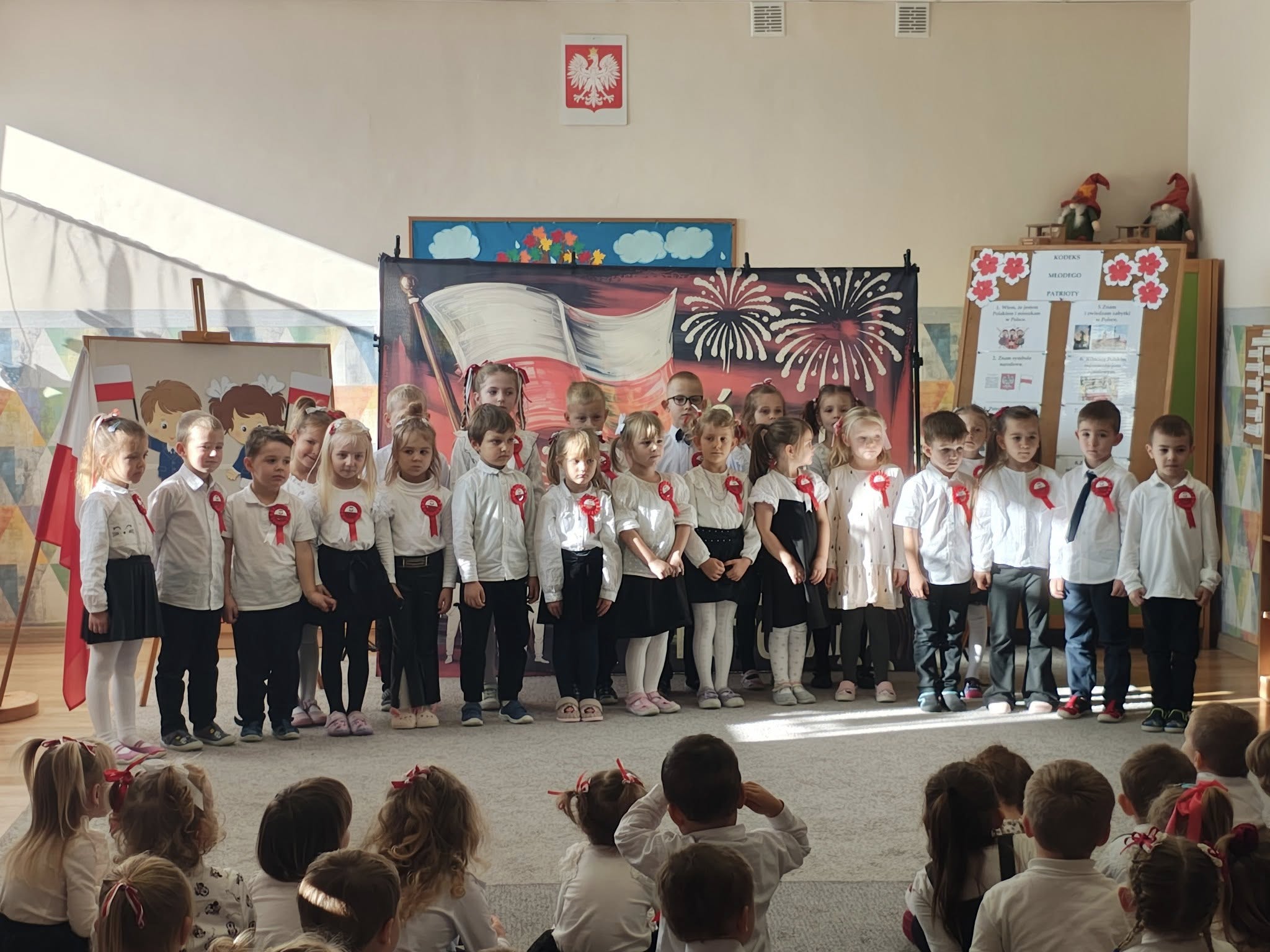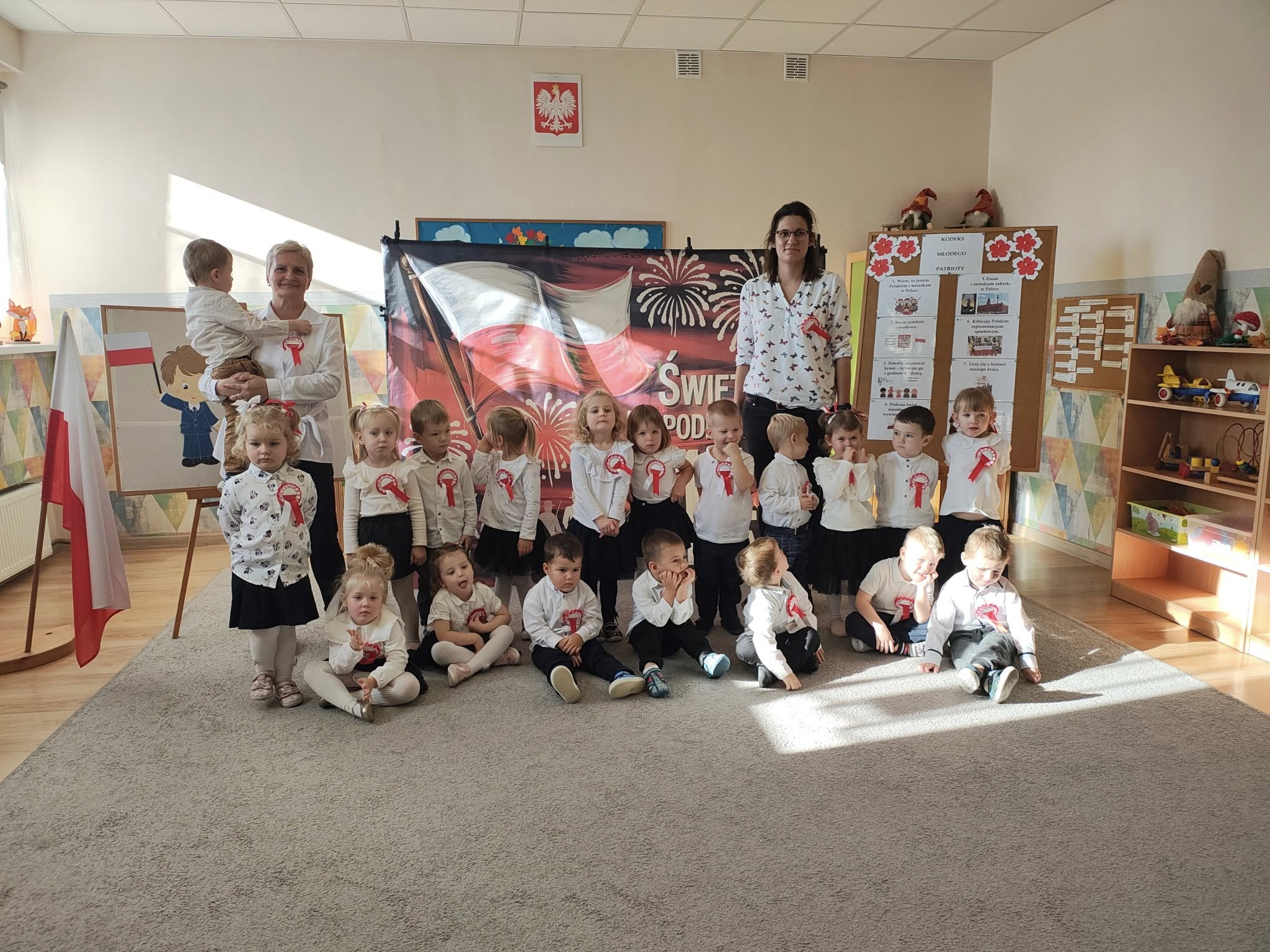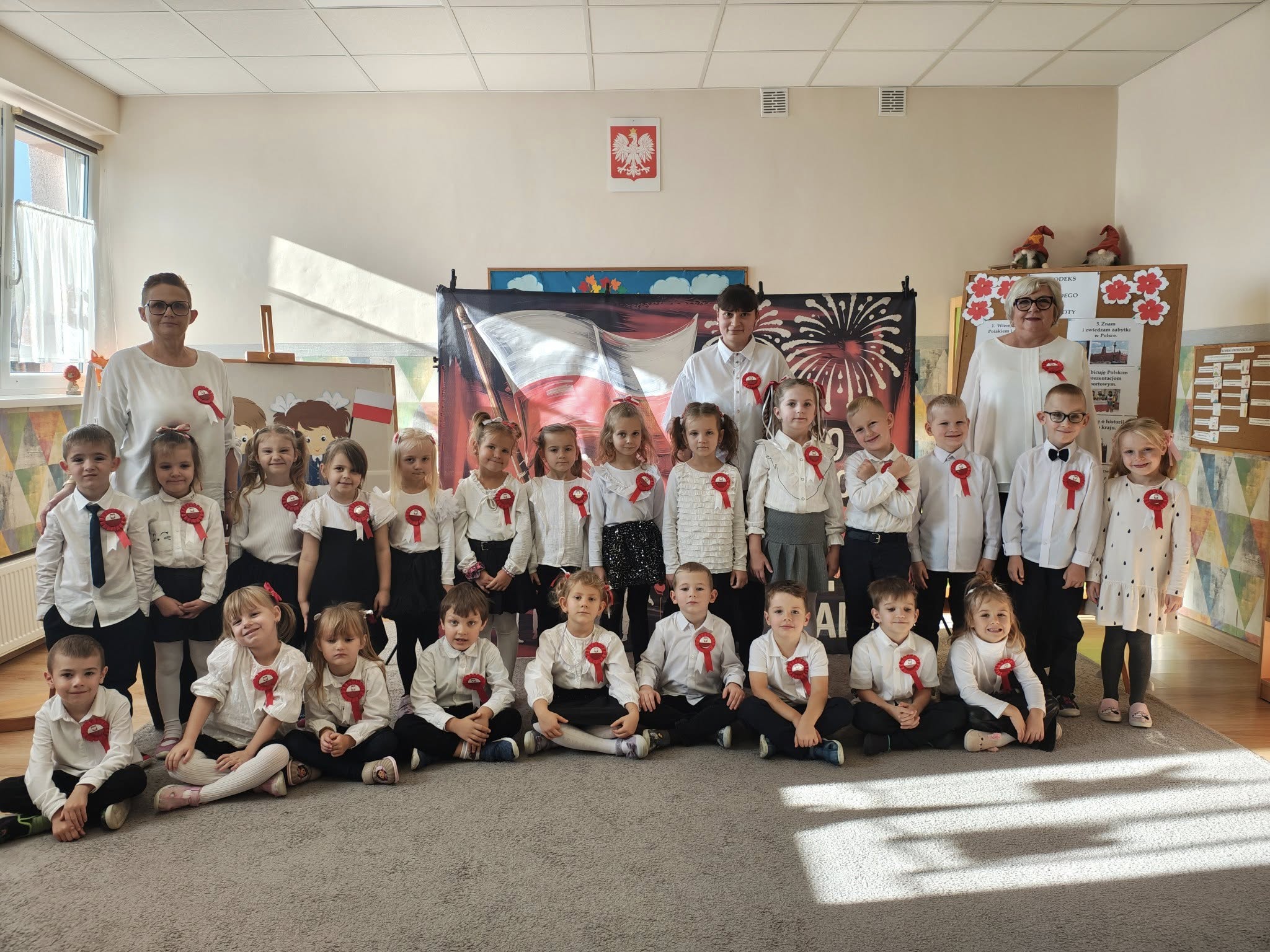 W przedszkolu odbyła się uroczystość z okazji Narodowego Święta Niepodległości. Dzieci odświętnie ubrane zaprezentowały wiersze i piosenki o tematyce patriotycznej. Włączyliśmy się również w ogólnopolską akcję „Szkoła do hymnu” i o symbolicznej godzinie 11.11 odśpiewaliśmy „Mazurka Dąbrowskiego”. Była to doskonała okazja, aby w przystępny sposób przybliżyć dzieciom historię naszego kraju, utrwalić symbole narodowe oraz ukazać znaczenie wolności i niepodległości Polski.