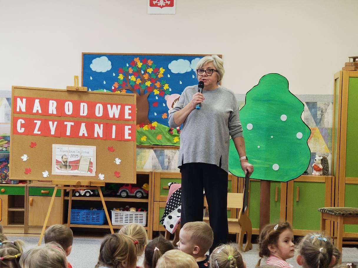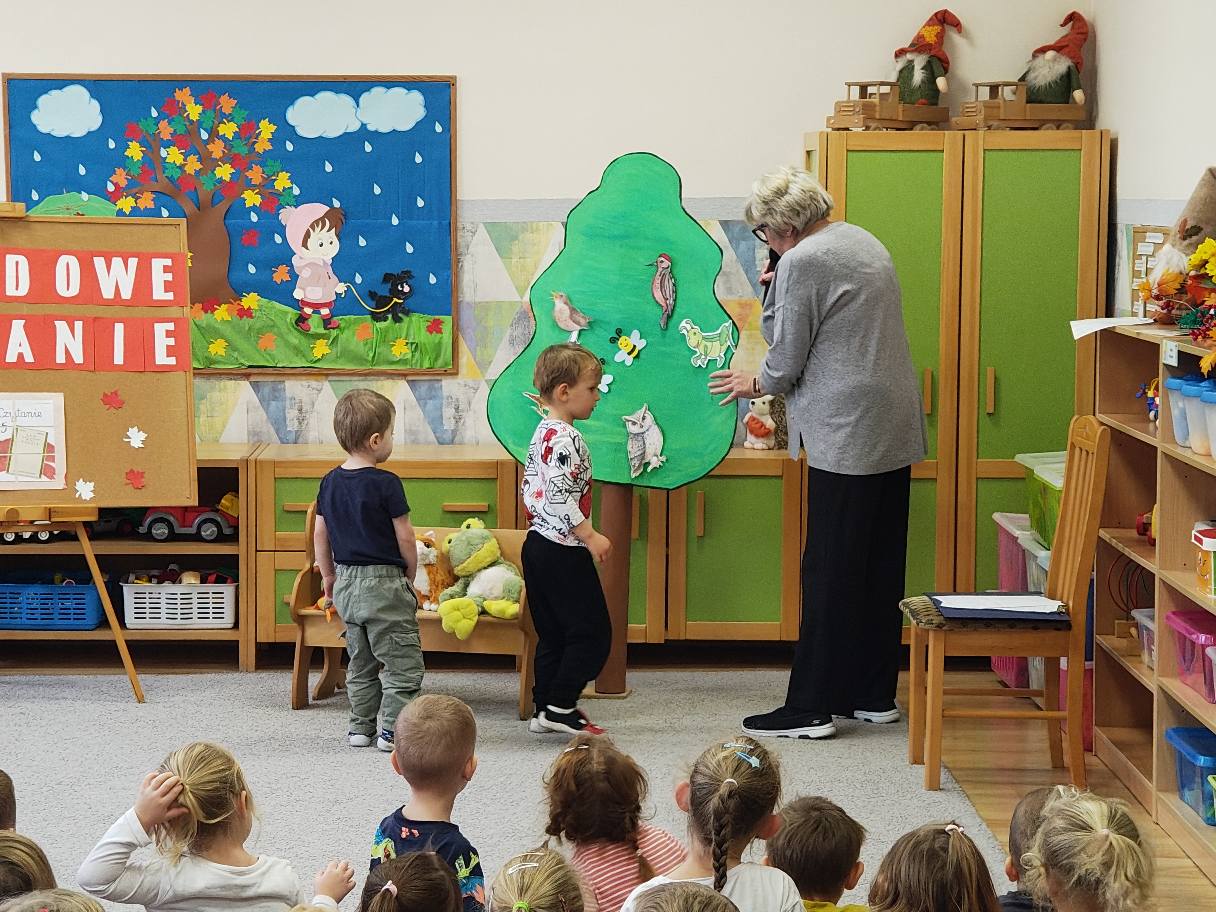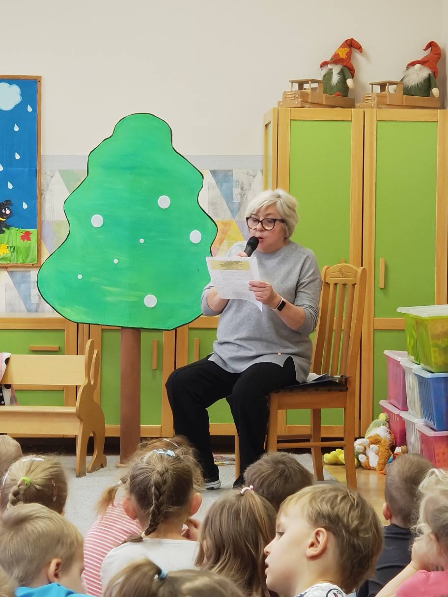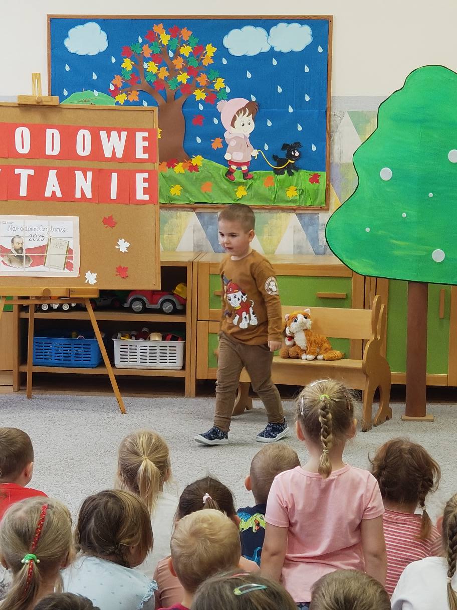 Udział w ogólnopolskiej akcji „Narodowe Czytanie”. Dzieci poznały fraszkę Jana Kochanowskiego „Na lipę”. Z zainteresowaniem uczestniczyły w czytaniu, poznając piękno poezji oraz atmosferę staropolskiego ogrodu. Odgadywały zagadki dźwiękowe, a następnie układały gości na ławeczce pod lipą. Przedszkolaki z zaangażowaniem przyczepiały owady i ptaki do sylwety drzewa współtworząc wesołą, pełną życia lipową scenę.