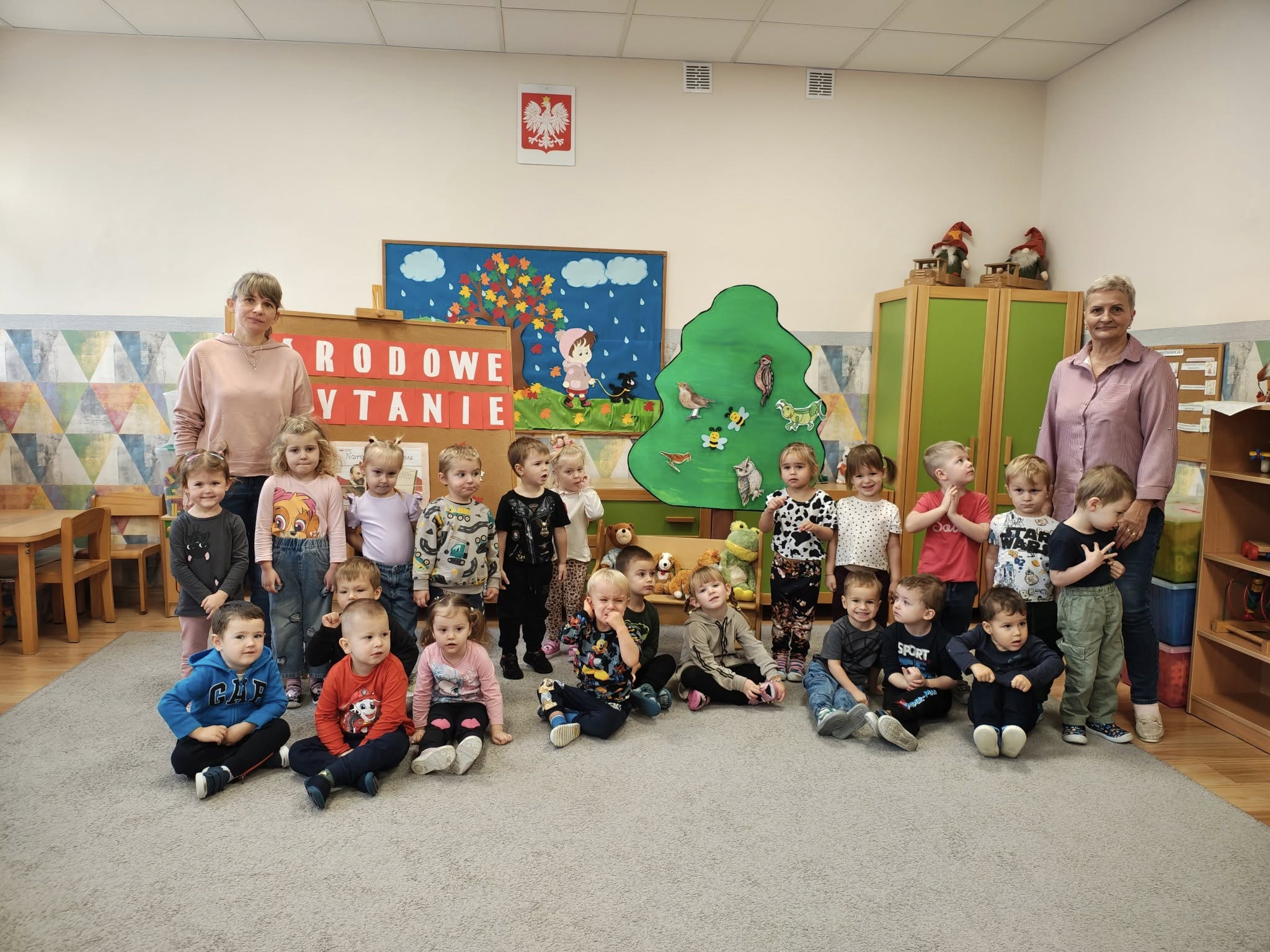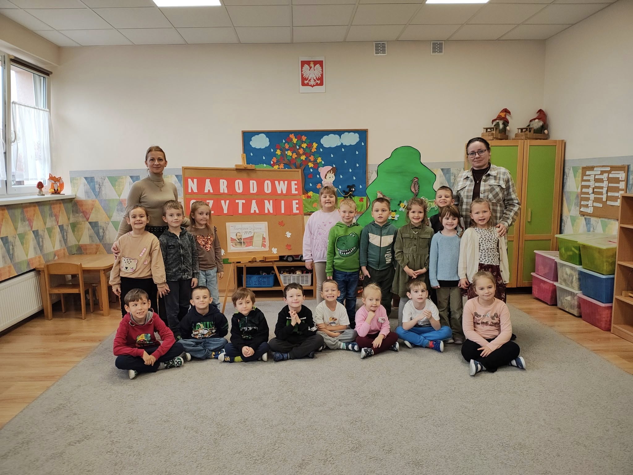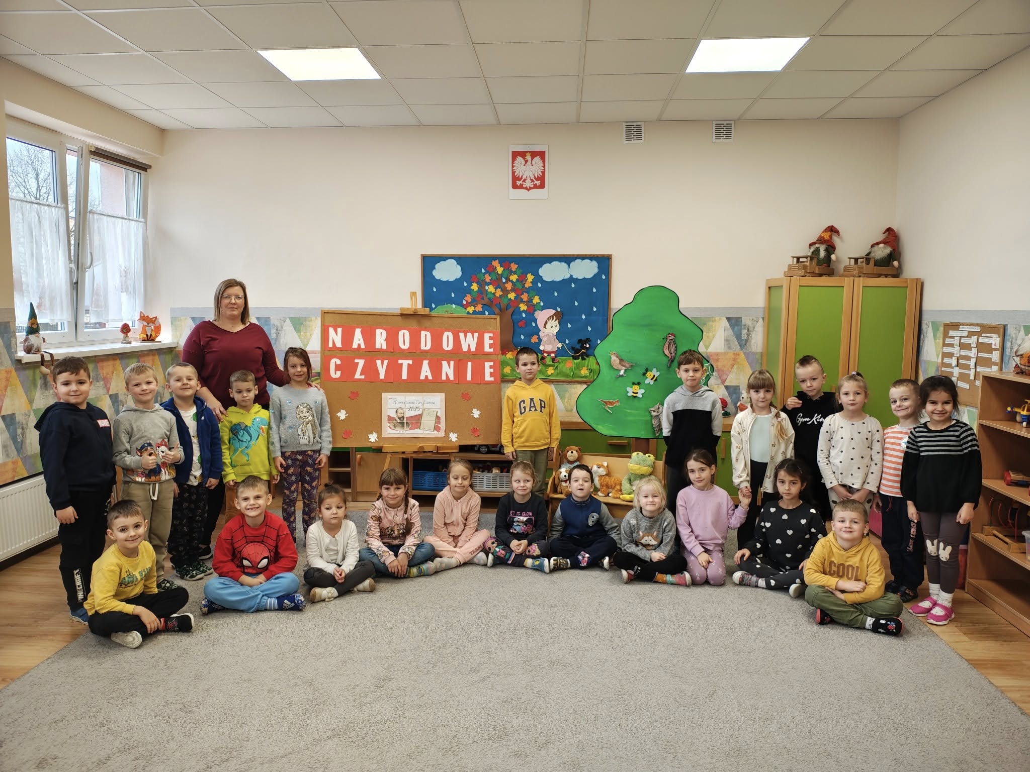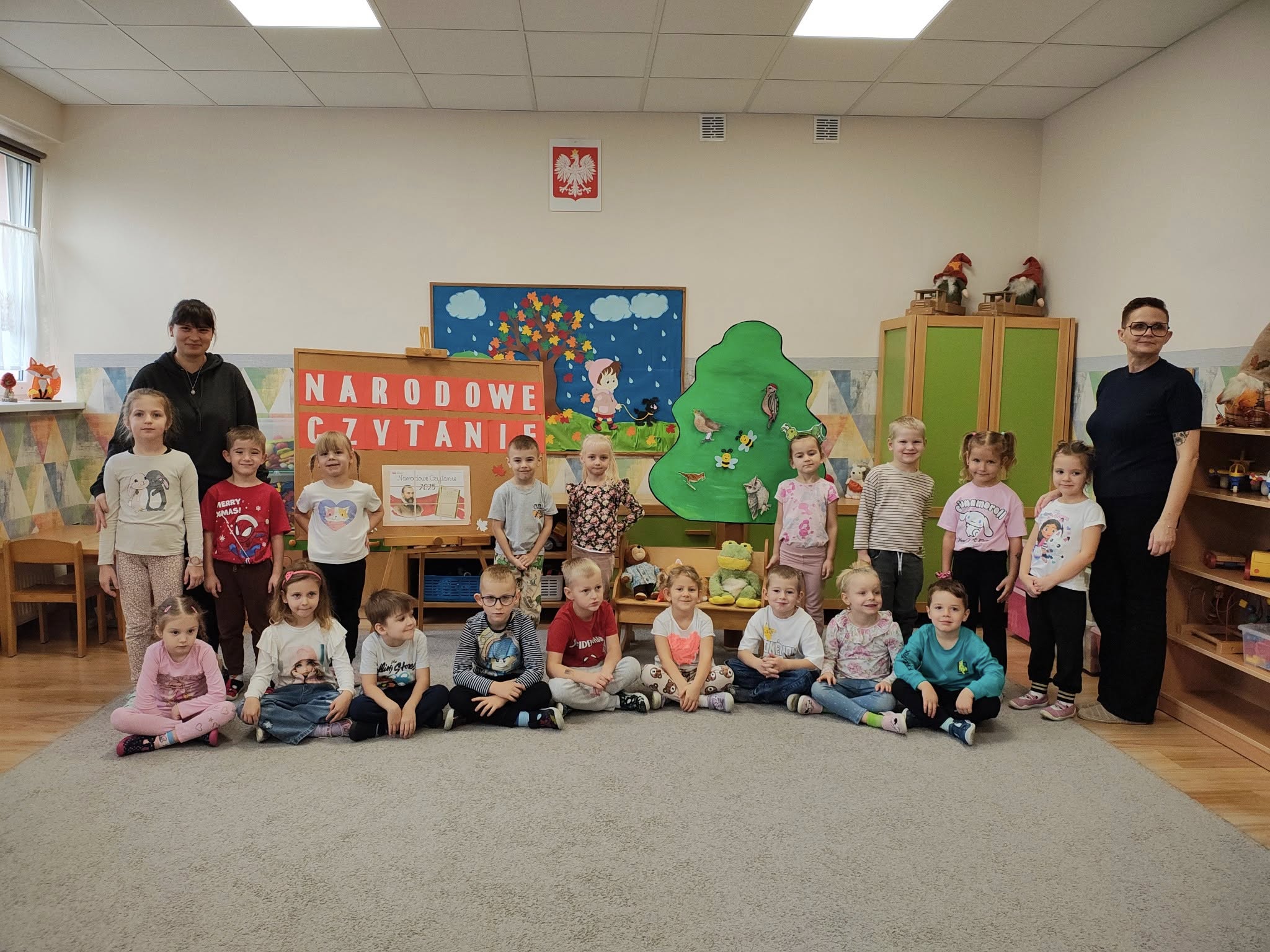Udział w ogólnopolskiej akcji „Narodowe Czytanie”. Dzieci poznały fraszkę Jana Kochanowskiego „Na lipę”. Z zainteresowaniem uczestniczyły w czytaniu, poznając piękno poezji oraz atmosferę staropolskiego ogrodu. Odgadywały zagadki dźwiękowe, a następnie układały gości na ławeczce pod lipą. Przedszkolaki z zaangażowaniem przyczepiały owady i ptaki do sylwety drzewa współtworząc wesołą, pełną życia lipową scenę.